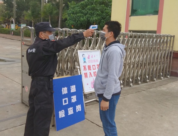 疫情發(fā)生后,學(xué)校及時實施了校園管制,由門衛(wèi)實施二十四小時值班制。并在校門口設(shè)置了“體溫口罩檢查崗”,要求入校人員必須佩戴口罩,并對所有進(jìn)入校園的人員進(jìn)行體溫檢測,體溫異常者禁入校園。目前,除個別值班的人員進(jìn)入校園外,其他包括師生在內(nèi)的一切人員均禁止出入校園。