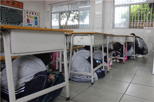 演練前學(xué)校政教處制定了詳細(xì)的演練方案,并由各班班主任給學(xué)生講述應(yīng)急避震的保護(hù)措施和震后自救知識(shí),特別強(qiáng)調(diào)了在家中、在學(xué)校如何防震避震的知識(shí)。其后政教處陳七靈干事再次強(qiáng)調(diào)了演練的相關(guān)要求,告訴學(xué)生在疏散時(shí)不要慌張,不要推擠,要嚴(yán)肅,要當(dāng)作是真的地震發(fā)生,而不是游戲,要在教師的引導(dǎo)和統(tǒng)一指揮下有序疏散。