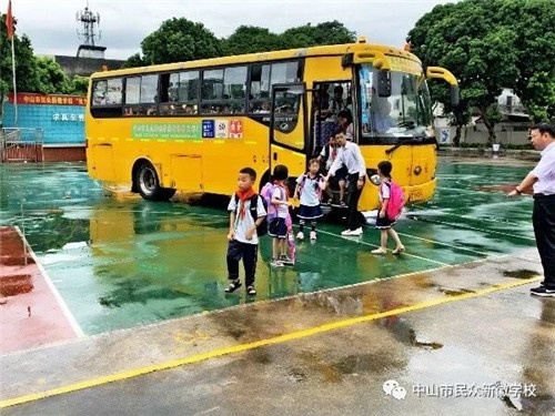 開學(xué)第一天清晨,雖然是細(xì)雨迷蒙,民眾新徽學(xué)校的行政及跟車?yán)蠋?:50就到達(dá)學(xué)校坐上校車去接所有乘車學(xué)生返校。校車到校后,跟車?yán)蠋熛认萝嚭鬅崆榍颐鎺⑿Φ叵蛎恳晃怀塑噷W(xué)生伸出扶助之手,確保他們安全平穩(wěn)的下車。學(xué)生都穿著新式校服臉上,洋溢著燦爛的笑容,下車后,根據(jù)指引教師的指引腳踏黃線邁著整齊劃一的步伐精神抖擻的走進自己的教室,邊走邊禮貌的向所見到的老師敬禮熱情問好。
