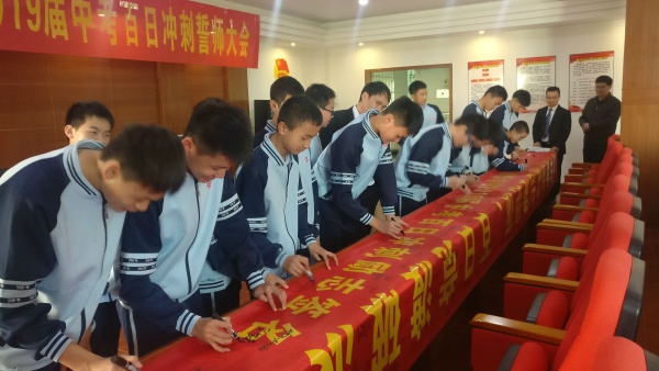 趁著場上同學(xué)們熱情高漲,王校長做了中考備考指導(dǎo)講話。王校長先談了今年九年級(jí)的中考目標(biāo),希望同學(xué)們繼續(xù)追求卓越,超越自我。同時(shí),還要有科學(xué)的復(fù)習(xí)計(jì)劃,按照計(jì)劃有條不紊地進(jìn)行備考。王校長對(duì)同學(xué)們昂揚(yáng)向上的精神風(fēng)貌給予了高度的肯定,堅(jiān)信德恒學(xué)校2019年中考一定會(huì)創(chuàng)造輝煌!場下同學(xué)們的掌聲經(jīng)久不息,氣勢(shì)如虹。最后,蘇樂樂同學(xué)帶領(lǐng)初三全體學(xué)生以青春的名義莊嚴(yán)宣誓:“目標(biāo)明確,積極向上;勤學(xué)苦練,斗志昂揚(yáng);講究方法,保質(zhì)保量;頑強(qiáng)拼搏,不棄不放;爭分奪秒,適度緊張;全力以赴,創(chuàng)造輝煌!”鏗鏘有力的宣誓詞響徹九霄,激起了德恒學(xué)子中考必勝的信心!九年級(jí)全體師生同在中考百日沖刺橫幅上勵(lì)志簽名,向中考百日發(fā)起斗士般的沖刺!