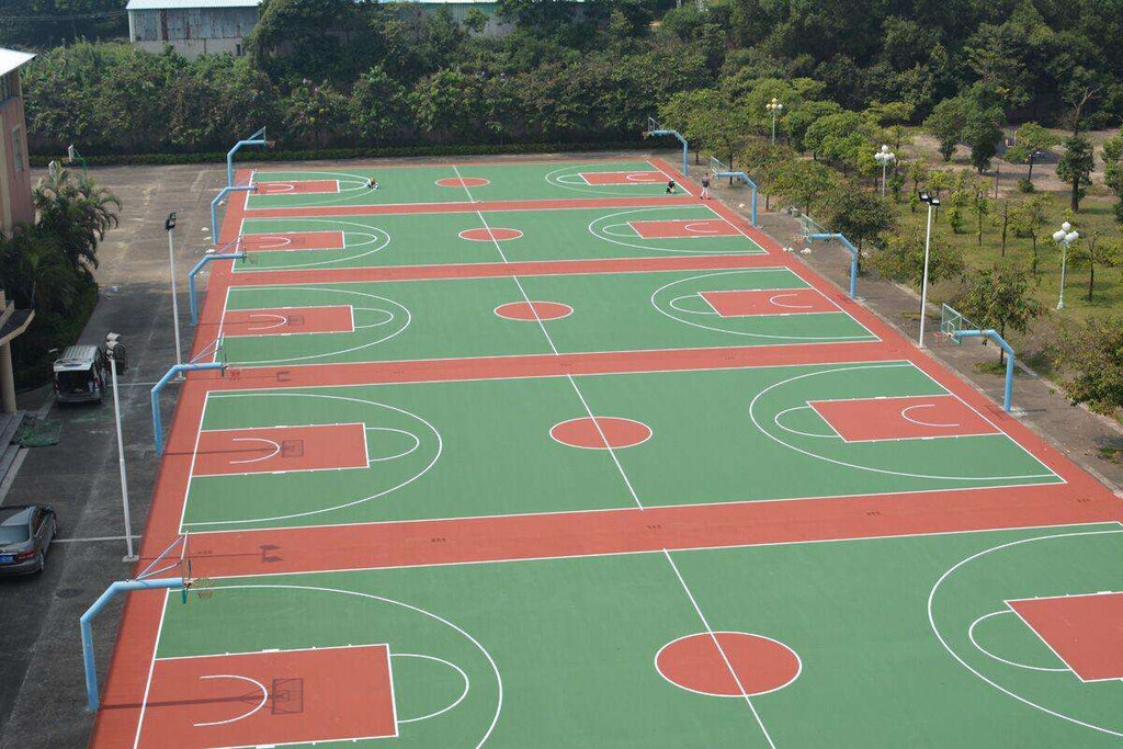 塑膠籃球場又稱全天候運動籃球場,基礎(chǔ)層是一個長方形的堅實平面,由聚氨酯預聚體