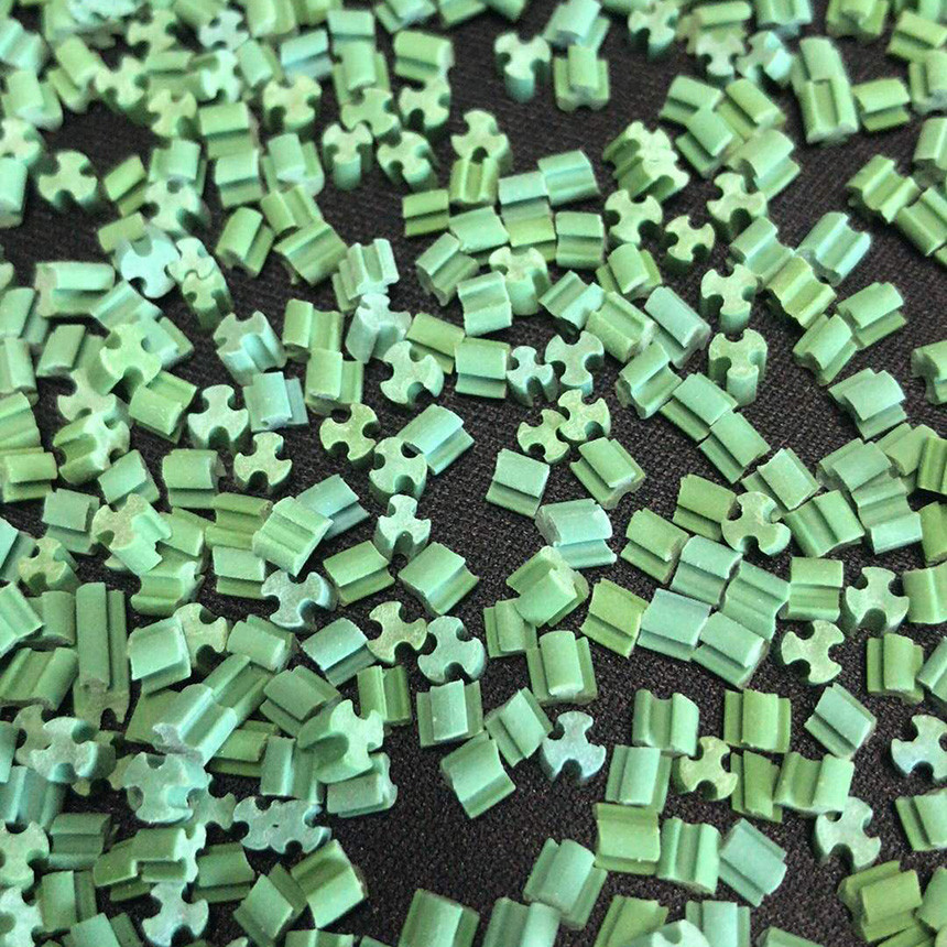 TPE 環(huán)保填充顆粒,非硫化物,屬于熱塑性彈性體,具環(huán)保、耐磨性強(qiáng)且擁有高回彈力,無毒無氣味,耐候性能優(yōu)異,美觀且耐高溫(初始軟化溫度達(dá)到 130°)等特點,是人造草坪填充的好的選擇。它采用擠出成型工藝,擁有破碎剪切顆粒無法比擬的堆積密度優(yōu)勢。簡單的說來就是越少的顆粒用量可以堆積越多厚度。