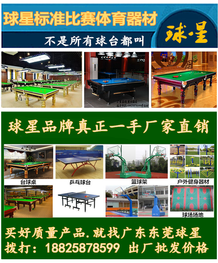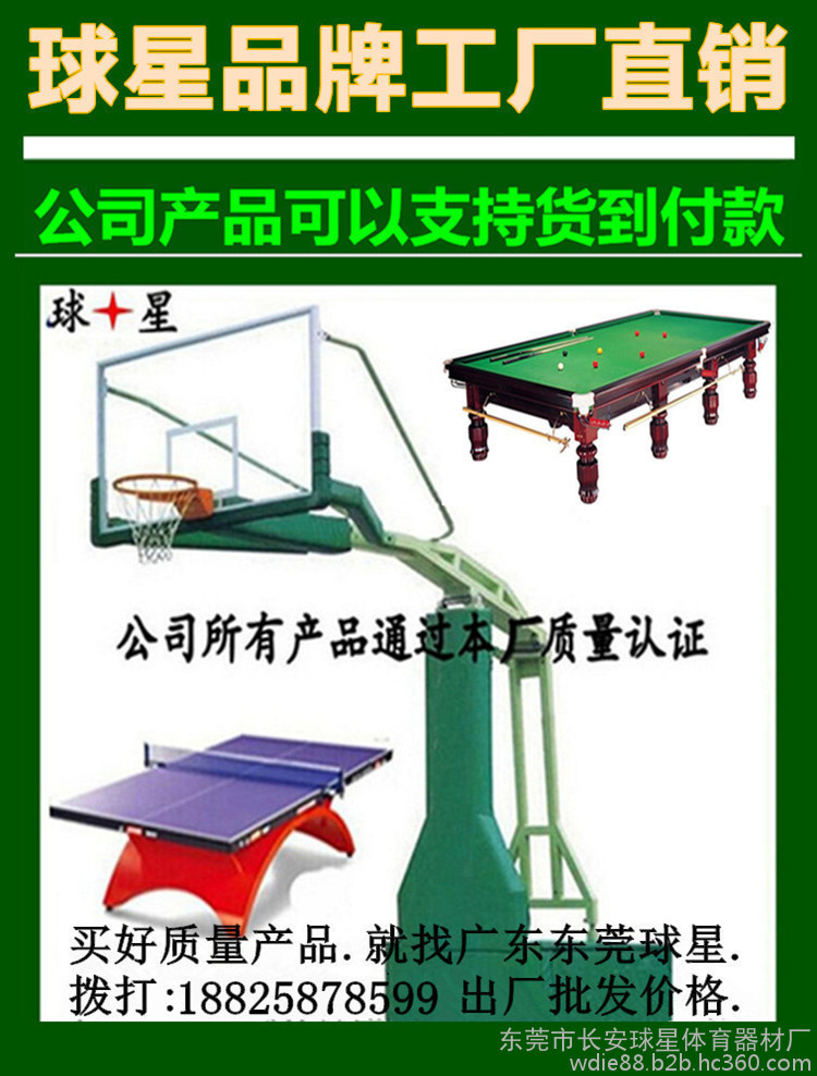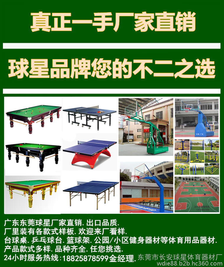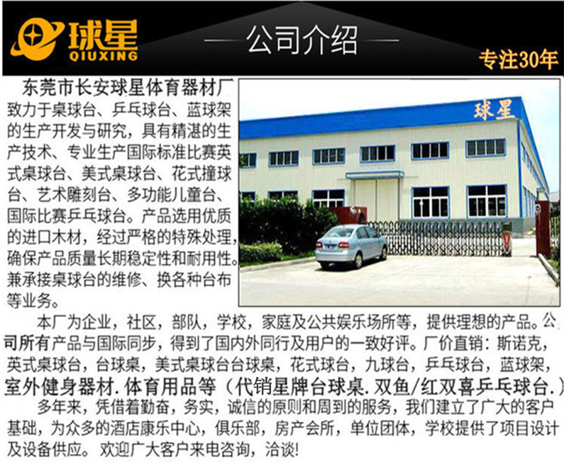 東莞市長(zhǎng)安球星體育器材廠(chǎng)集三十多年管理、制造經(jīng)驗(yàn),專(zhuān)業(yè)制造桌球臺(tái)、乒乓球臺(tái)、籃球架、桌上足球.公園.小區(qū)健身器材等./等體育用品。秉著質(zhì)量至上,信譽(yù)好的原則,所做產(chǎn)品深受客戶(hù)好評(píng)。桌球臺(tái)、乒乓球臺(tái)、籃球架.桌上足球.公園小區(qū)健身器材五個(gè)系列產(chǎn)品遠(yuǎn)銷(xiāo)歐洲,南、北美洲,澳大利亞及部分阿拉伯**。