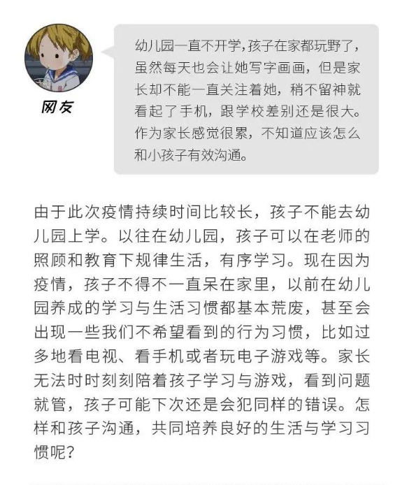 教育部說,疫情期間,學齡前兒童面臨生活學習習慣改變,過多看電視、手機或玩電子游戲等問題。家長應該怎樣和孩子溝通?如何共同培養(yǎng)良好生活與學習習慣?心理專家給出了“合理居家作息時間安排”“與孩子共同制定居家活動計劃”等5方面有針對性的建議。