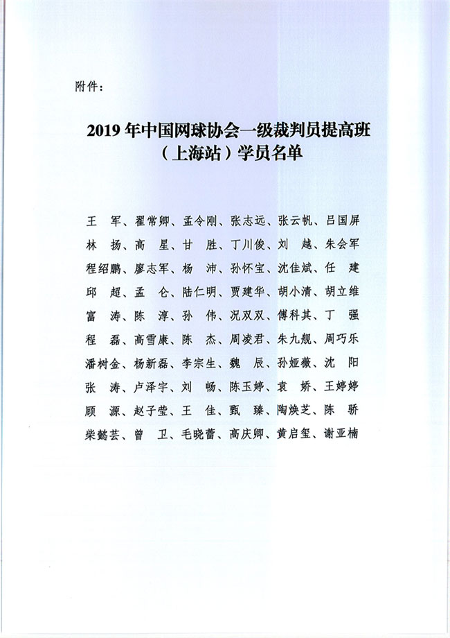 2019年中國(guó)網(wǎng)球協(xié)會(huì)一級(jí)裁判員提高班(上海站)補(bǔ)充通知