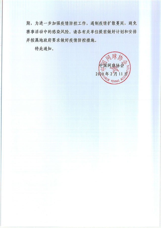 中國網(wǎng)球協(xié)會關(guān)于延期和取消舉辦4月份賽事的通知