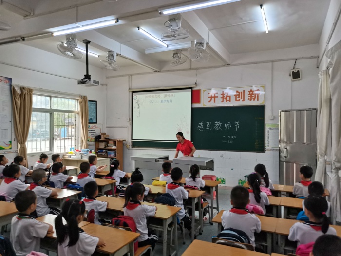 升旗儀式上,沈蓓蕾老師以教師節(jié)作為向?qū)W生傳達尊師重教意義的重要契機進行了以“尊師重道,感謝師恩”為主題的國旗下講話,以弘揚尊師重道的良好風尚,讓學生學會銘記師恩。隨后的感恩教師主題班會上,各班班主任首先向?qū)W生介紹了教師節(jié)的由來,其次以問題引入主題,讓同學思考:如何敬老師、報師恩,了解老師的工作。同時,也以張麗莉、殷雪梅老師汽車之下救孩童和袁文婷、譚千秋老師災難時刻為救學生獻生命的真實感人事跡讓學生明白老師義無反顧的愛。言語中的情誼,行動中的愛與責任。此時,一首《每當我走過教師窗前》緩緩響起,伴隨著音樂,大家一起靜靜懷想,默默祝?!?/p>