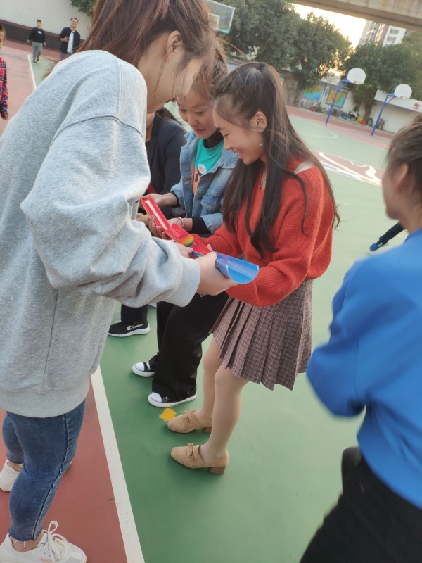 下午四點(diǎn)整,在祝校的組織下,八個(gè)競(jìng)賽小組整齊列隊(duì)于后操場(chǎng),舉行了簡(jiǎn)短的開(kāi)幕式。隨后,主持人嚴(yán)老師為大家詳細(xì)介紹了此次活動(dòng)的具體內(nèi)容與流程,并重點(diǎn)強(qiáng)調(diào)了“背靠背運(yùn)球”、“投環(huán)圈”、“不倒森林”、“歌王爭(zhēng)霸”等具體環(huán)節(jié)的注意事項(xiàng)。隨著一聲哨響,早已摩拳擦掌、躍躍欲試的“運(yùn)動(dòng)員”們開(kāi)始了競(jìng)技大比拼。一時(shí)間,吶喊助威聲此起彼伏,整個(gè)現(xiàn)場(chǎng)也隨之熱鬧了起來(lái):有的隊(duì)員一點(diǎn)就通,還不忘來(lái)回給自己的隊(duì)員示范;有的隊(duì)員一知半解,動(dòng)作也不協(xié)調(diào);有的隊(duì)員五音不全,還忘記了歌詞,充當(dāng)了喜劇演員,把大家逗得捧腹大笑;有的甚至忘記了裁判的存在,自顧自的玩起來(lái)……活動(dòng)最后,在“自己動(dòng)手、豐衣足食”的環(huán)節(jié)中,籌備組還為大家端出了精心準(zhǔn)備的食材,老師們也紛紛擺開(kāi)陣勢(shì),扮演起了“大廚”的角色,為大家?guī)?lái)了一場(chǎng)別具一格的“美食匯”。在一片歡聲笑語(yǔ)中,本次活動(dòng)也逐漸落下了帷幕。