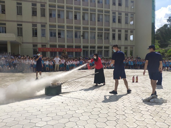 活動(dòng)最后,消防員向同學(xué)們講解了消防車的構(gòu)造和功能、模擬消防車水槍參與滅火的場景。除此之外,現(xiàn)場示范和講解滅火器的使用步驟和注意事項(xiàng),并由教師代表操作滅火器進(jìn)行現(xiàn)場滅火演練。