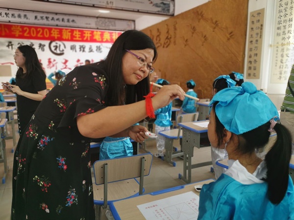 吳校長帶領著學校老師俯下身依次在每一個孩子的額頭正中央點一顆紅痣?!梆搿蓖ā爸恰?,意為開啟智慧,蘊含著對新生們的美好期許。艷麗的朱砂不僅點新生的額頭上,更深深地印在了他們的心中。學校還邀請已退休教師董印生回校,為新生們擊鼓三聲,寓意深刻。