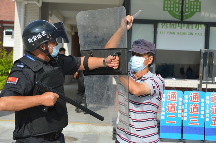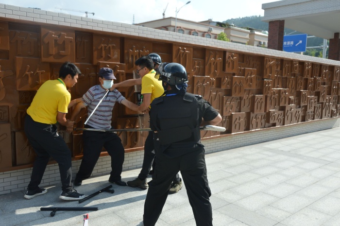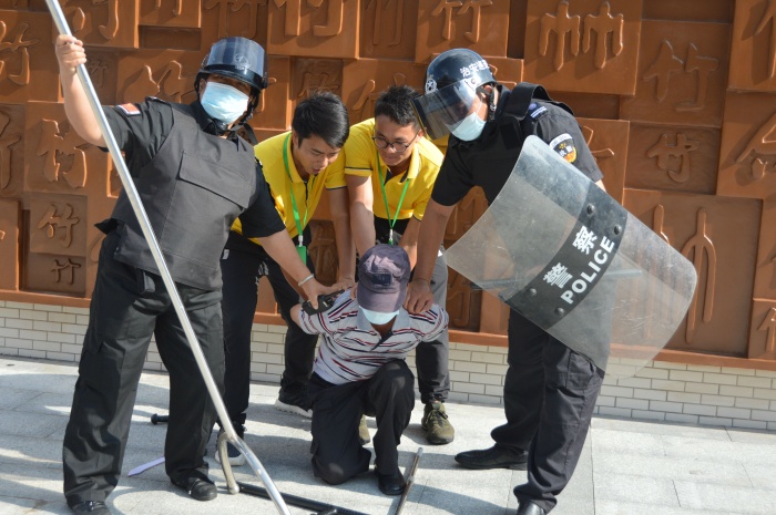 演練開始,校門外一名暴恐分子假稱學(xué)生家長(上課時(shí)間不允許探望)探望小孩為由無視保安的勸阻,強(qiáng)行闖入校區(qū)并掏出兇器,尋機(jī)準(zhǔn)備傷害學(xué)生。一名保安迅速戴頭盔持戰(zhàn)術(shù)盾牌、橡膠棍、趕到現(xiàn)場(chǎng),阻止犯罪分子向?qū)W生集中處靠近,把同學(xué)保護(hù)在身后,與犯罪分子對(duì)峙,同時(shí)喊話“放下武器,不要闖入校區(qū)傷害學(xué)生?!绷硪幻0舶聪隆耙绘I式報(bào)警器”并撥通校防暴反恐組組長電話報(bào)告情況。應(yīng)急小組即刻報(bào)告校長,啟動(dòng)應(yīng)急預(yù)案,全體師生開始迅速往安全區(qū)域逃離。各班老師立即將教室的門、窗戶關(guān)緊上鎖,并保護(hù)孩子躲避到安全區(qū)域。防暴反恐組接到警報(bào)后,手持“長柄的防暴叉”、“警棍”等武器從四周沖向“歹徒”,實(shí)行截堵,并與“歹徒”周旋。經(jīng)過搏斗,最終成功將“歹徒”制服,押送派出所處理。