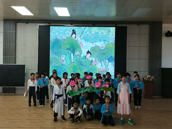 接著進(jìn)行比賽的是中年級(jí)學(xué)生。三、四年級(jí)的學(xué)生各個(gè)精神抖擻,信心十足。有的班級(jí)穿上漢服,一展古韻風(fēng)姿;有的班級(jí)手拿表演道具,讓表演更加精彩。其中三(3)班的孩子拿著荷葉、荷花,吟誦著《采蓮曲》,宛如把聽(tīng)眾帶進(jìn)詩(shī)的世界。