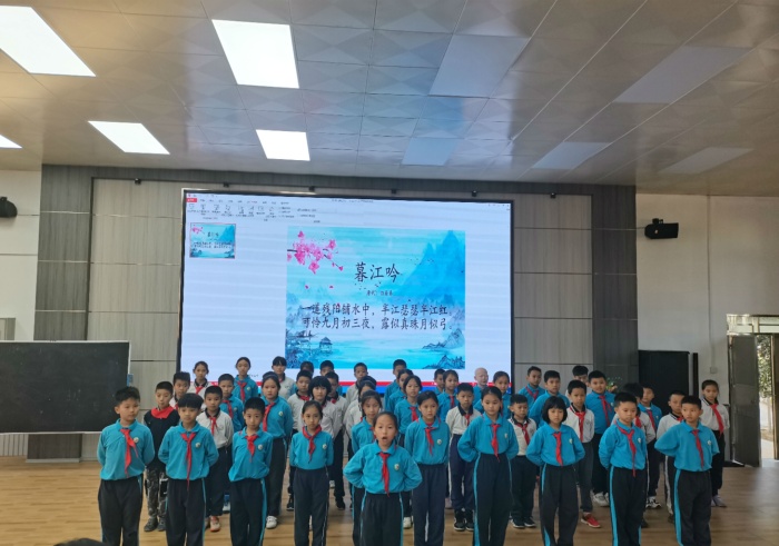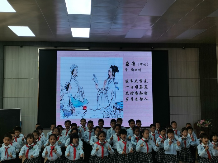 最后進(jìn)行比賽的是高年級(jí)學(xué)生。五、六年級(jí)的學(xué)生吟誦起來(lái)更有一番韻味,學(xué)生的朗誦聲響亮整齊,讓人特別享受。