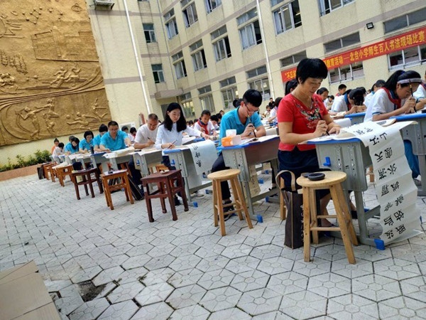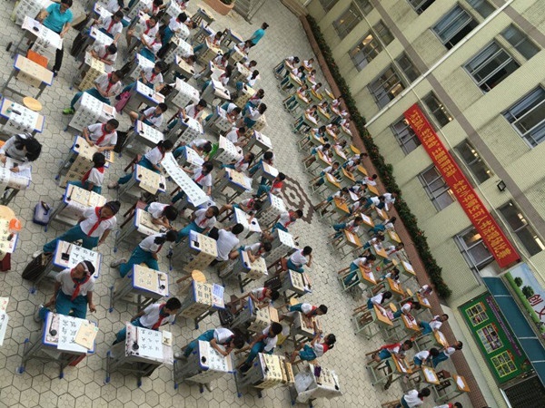 本次活動(dòng)吸引了許多師生,參與度高,全校師生紛紛踴躍報(bào)名。當(dāng)天下午,師生齊聚學(xué)校小廣場(chǎng),井然有序地?cái)[放桌椅,布置好書(shū)法比賽現(xiàn)場(chǎng)。緊接著,報(bào)名參加比賽的同學(xué)排著隊(duì),拿好筆墨和毛氈走進(jìn)比賽現(xiàn)場(chǎng),并快速、有序地按照老師安排的座位坐好。