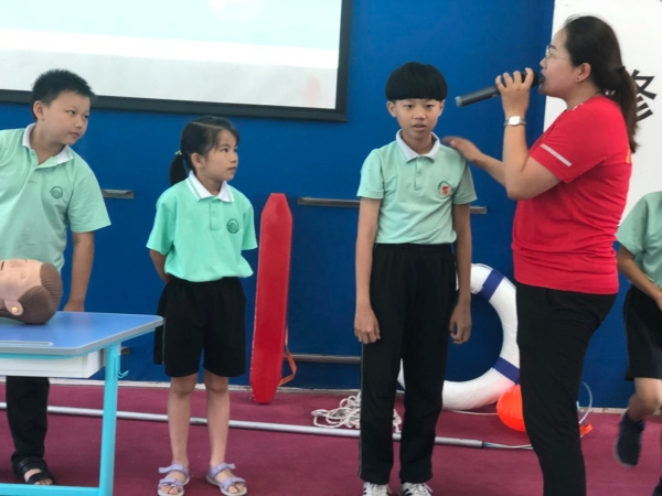 畢老師介紹了游泳應(yīng)該注意的問(wèn)題,遇到同伴落水意外情況如何施救,還傳授給學(xué)生水中抽筋的自救方法,以及一套規(guī)范的心肺復(fù)蘇基本方法。在座的全體學(xué)生聽(tīng)得仔細(xì),記得認(rèn)真,還積極參與知識(shí)競(jìng)答。進(jìn)一步增強(qiáng)了師生的自救技能和本領(lǐng),講師還講解了溺水的急救知識(shí)以及救生圈、救援繩等一些救援器材的使用方法,并告誡學(xué)生們,暑期到了不要在沒(méi)有大人的監(jiān)護(hù)下到深水區(qū)游泳玩耍以免發(fā)生溺水。