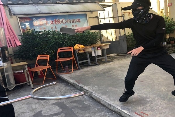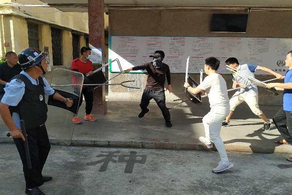 本次模擬場景:清晨,學(xué)生上完早讀課后,正三三兩兩地走出課室的時候,一名蒙面的持刀歹徒突然闖進校園。學(xué)校立即啟動安全預(yù)防校園暴力事件應(yīng)急預(yù)案,學(xué)校德育處郝利娟主任播放警情通知:“有歹徒闖入校園,同學(xué)們快速到安全地方!全體老師快速到班級!” 安全組一名老師打電話報警,在學(xué)校附近的巡警火速趕到了現(xiàn)場。學(xué)校保安室三名保安人員立即持鋼叉和盾牌,老師們則有的持長棍,有的隨手抓起板凳、鐵鍬等工具上前驅(qū)趕,在警察的配合下,大家一起將暴徒制服,最后警察將暴徒緝拿帶走。