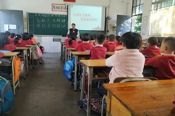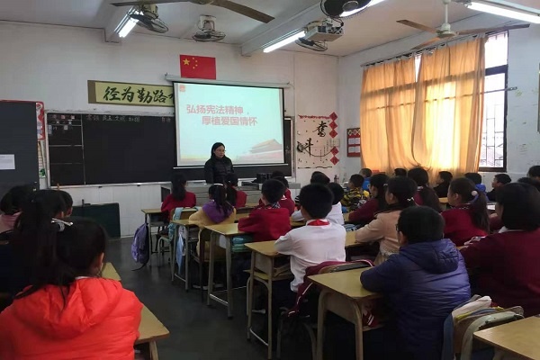 升旗儀式結(jié)束之后,各班在班主任的帶領(lǐng)下,舉行了“憲法晨讀活動”?!爸腥A人民共和國是工人階級領(lǐng)導(dǎo)的、以工農(nóng)聯(lián)盟為基礎(chǔ)的人民民主專政的社會主義國家......”陣陣讀書聲從校園里傳出來,傳到很遠(yuǎn)的地方去,憲法精神也像這響亮的童聲一樣響徹校園,影響著更多的人。