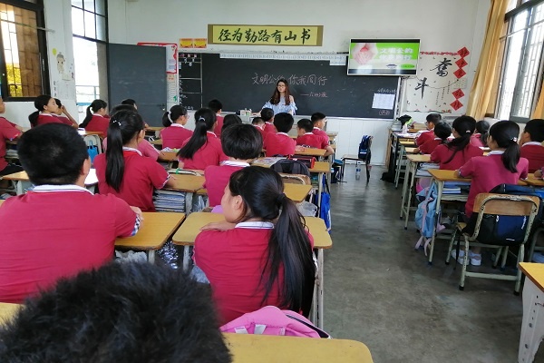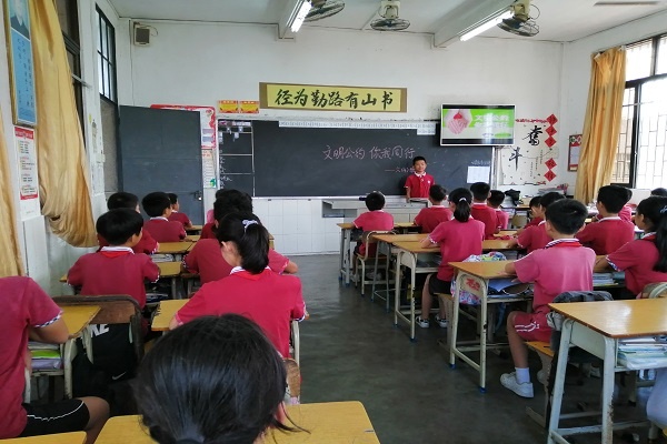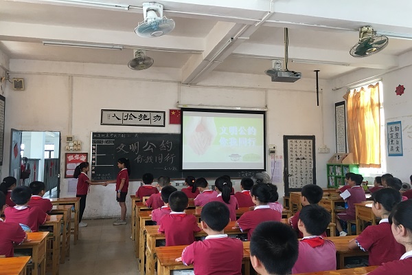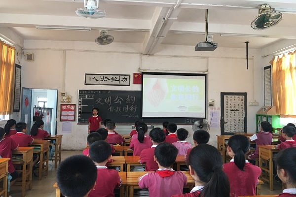 班會課上,學生和老師共同朗讀了這份《中山市文明公約》。老師從公約的內容出發(fā),帶領學生共同學習“友善”、“誠實”的含義,引導學生在平常的生活當中學會友善待人,言而有信。老師通過舉例子,引導學生體會在公共場所內不追逐打鬧不喧嘩的重要性,更提醒學生在圖書館、電影院等安靜的場所要學會用耳語,要自覺排隊,不與他人爭搶。勤儉節(jié)約是中華民族的傳統(tǒng)美德,老師出示了平常看到學生午餐時浪費糧食的圖片,讓學生感受到浪費的可恥。同學們也紛紛積極表示不能隨地扔垃圾,要隨手撿起身邊的垃圾,提醒爸爸媽媽車輛不能亂停亂放等。提醒孩子要從身邊的小事做起,從自己的一言一行做起,爭當文明小公民。