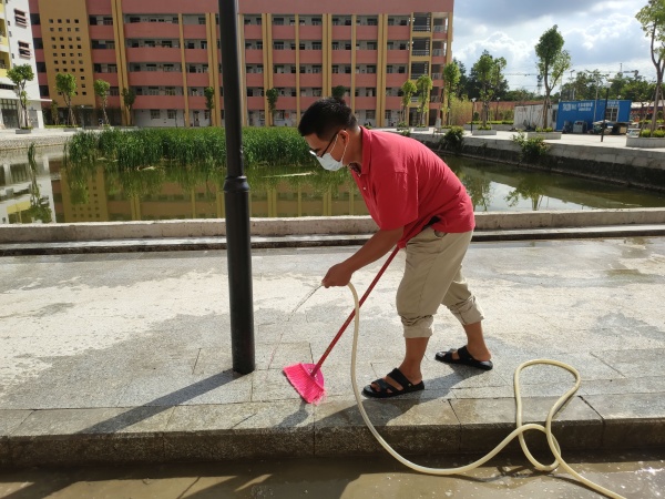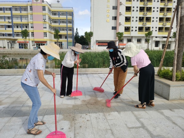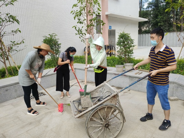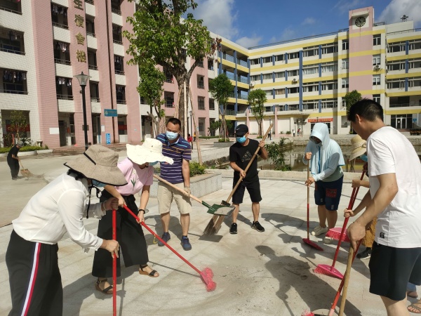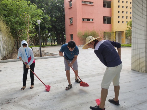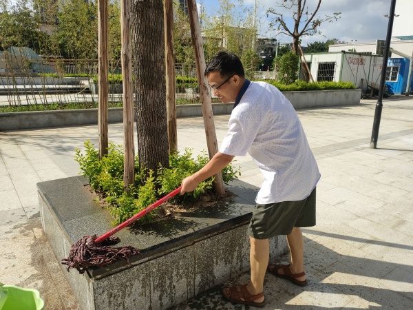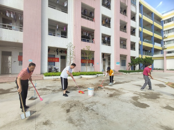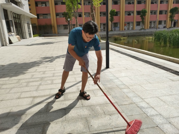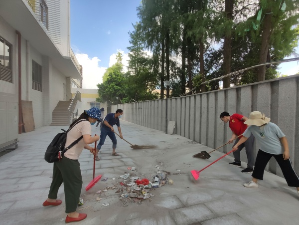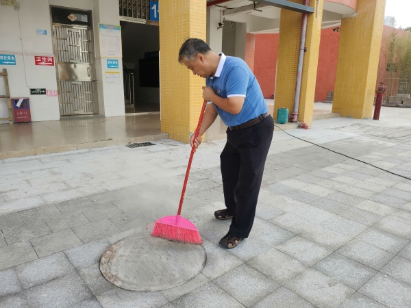 行動中,烈日當空,炙烤著大地,教師們面對校園景觀改造工地地面塵土堆積,碎石隨處可見,生活垃圾隱匿角落的景象沒有就此退縮,反而熱情高漲,手拿大掃帚,扛著大鐵鏟,推著斗車,興致勃勃地投入到清潔行動中。為了把塵土堆積的地面進行徹底地清潔,有的教師拿著水管來沖刷,有的教師拿著拖把來清理;為了把隱匿在空調主機背后的生活垃圾,盧新泉校長用未戴手套的雙手清理垃圾,在盧校長的率先垂范下,幾位初一級老師紛紛用手把垃圾清理干凈,充分發(fā)揮了不怕累、不怕臟的精神;他們如此認真地清潔,如此勤懇地付出,是因為把學校當做家呀!即便是揮汗如雨,依舊義無反顧,教師們的行動保證了校園各個角落干凈整潔。