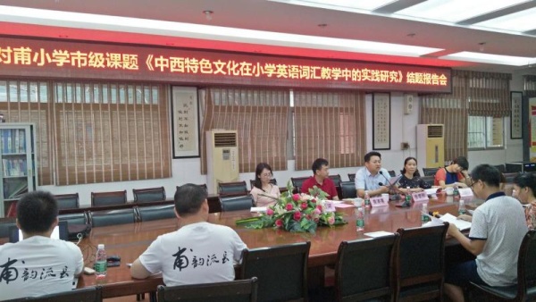 2019年6月27日上午,黃圃鎮(zhèn)對甫小學會議室里進行著該校市級立項課題《中西特色文化在小學英語詞匯教學中的實踐研究》結題報告會。本次邀請了中山市教研室教研員張?zhí)﹦偫蠋?、中山市實驗小學陳玉河老師、南區(qū)竹秀園小學藍韶英老師和黃圃鎮(zhèn)教育事務指導中心袁港喜副主任前來參會。