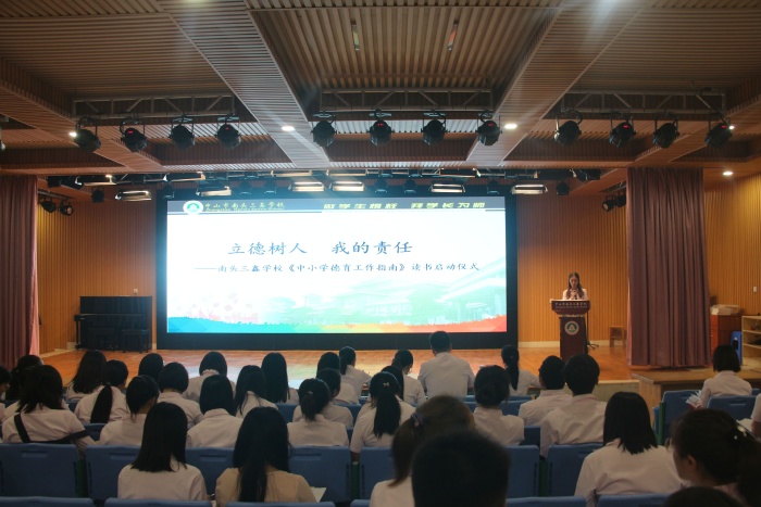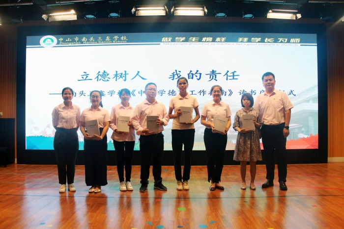為了為深入貫徹落實(shí)立德樹人根本任務(wù),加強(qiáng)對中小學(xué)德育工作的指導(dǎo),切實(shí)將黨和國家關(guān)于中小學(xué)德育工作的要求落細(xì)落小落實(shí),著力構(gòu)建方向正確、內(nèi)容完善、學(xué)段銜接、載體豐富、常態(tài)開展的德育工作體系,大力促進(jìn)德育工作專業(yè)化、規(guī)范化、實(shí)效化,努力形成全員育人、全程育人、全方位育人的德育工作格局,近日,中山市南頭三鑫學(xué)校舉行了“立德樹人,我的責(zé)任”為主題的《中小學(xué)德育工作指南》讀書啟動儀式,陳爾琪校長和鄧旭副校長在臺上為老師們頒發(fā)了德育書籍。