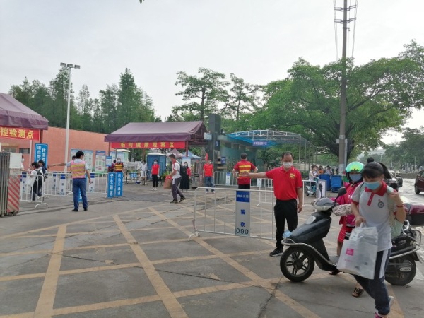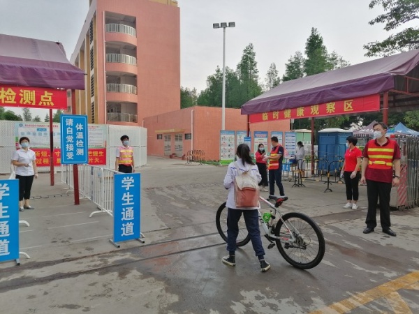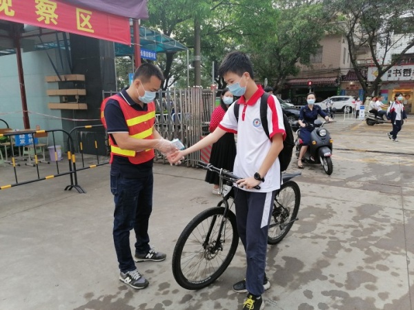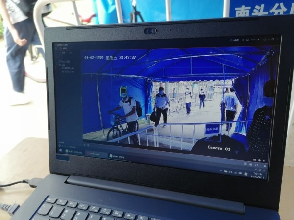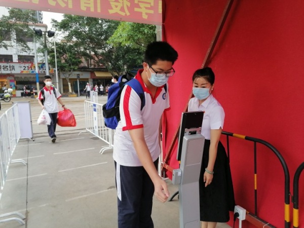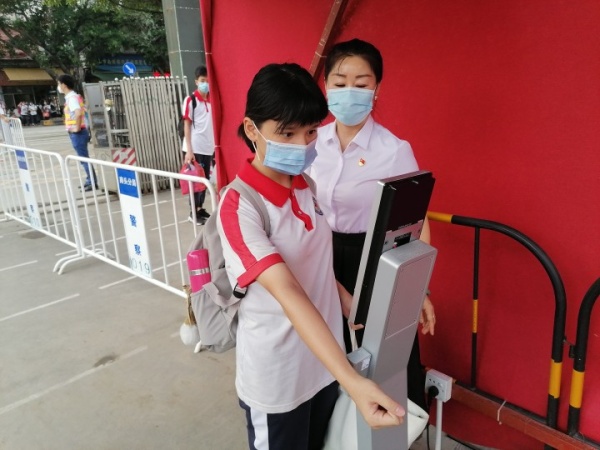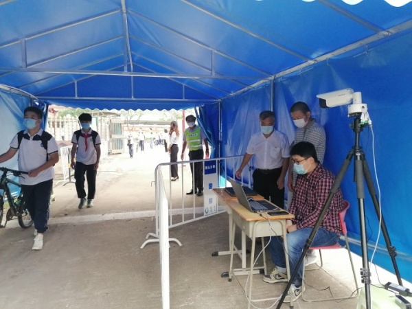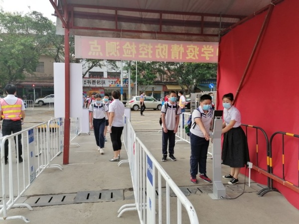中山市教育和體育局檢查組蒞臨南頭鎮(zhèn)初級中學檢查開學工作。在學校南門,同學們有序地相隔一米,自覺接受體溫檢測,檢測通過后,按照要求停放自行車,回教室安坐。在北門,科技助力學生返校,南頭鎮(zhèn)初級中學在校門口設(shè)置了人體熱感測溫系統(tǒng),可實現(xiàn)立馬測溫讓學生快速通過,避免扎堆。