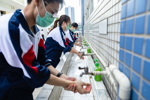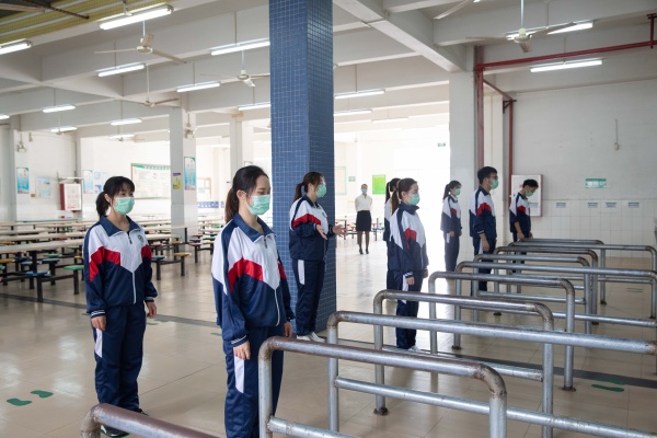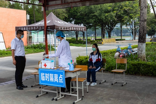 學(xué)校大門是校園疫情防控的第一道防線,故演練拍攝首先從學(xué)生進(jìn)入校門開始。校門口拍攝包含了三個場景,一是學(xué)生戴口罩,按要求進(jìn)行排隊(duì),由教師測量體溫。二是有學(xué)生出現(xiàn)體溫異常,送至隔離區(qū),由校醫(yī)進(jìn)行復(fù)檢。三是學(xué)校老師或外來人員進(jìn)入學(xué)校前進(jìn)行粵康碼的掃描。為了呈現(xiàn)良好效果,需要不斷重復(fù),但是,“學(xué)生”毫無怨言,只希望能為順利復(fù)學(xué)盡自己一份力。