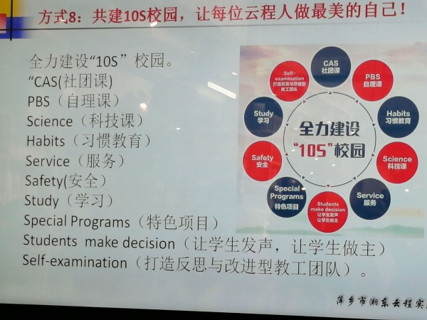 下午2:00,我們來(lái)到了一所遠(yuǎn)近聞名的私立學(xué)校一一萍鄉(xiāng)市湘東云程實(shí)驗(yàn)學(xué)校。在劉方清校長(zhǎng)的引領(lǐng)下,我們饒有興致地參觀了教學(xué)區(qū)、學(xué)生公寓、操場(chǎng)、音樂(lè)館、圖書館。給觀賞者這樣一種印象:英倫風(fēng)格的建筑群,植樹(shù)成林,彎木成景,楹聯(lián)文化的嫻熟運(yùn)用,頗具個(gè)性的書香校園……在圖書館,紙墨飄香,沁人心脾。我們圍坐在一起,靜靜地傾聽(tīng)劉校長(zhǎng)的辦學(xué)歷程。他特別指出:激勵(lì)云程人愛(ài)校好學(xué)的八種方式。1、隨處可見(jiàn)的作品,讓你做最美的自己;2、師生先進(jìn)事跡上墻,讓你做最美的自己;3、師生"品質(zhì)十佳"評(píng)選,讓你做最美的自己;4、光榮榜上墻,讓你做最美的自己;5、九表治班,讓你做最美的自己;6、小組動(dòng)態(tài)評(píng)價(jià),讓你做最美的自己;7、可視性獎(jiǎng)勵(lì),讓你做最美的自己;8、師生共建10S校園,讓每位云程人,做最美的自己。報(bào)告完畢,掌聲蓮連。南頭鎮(zhèn)優(yōu)秀班主任譚蘭華老師就云程的綜合管理、校容校貌等方面發(fā)表了自己的見(jiàn)解:云程上下一心,系統(tǒng)地管理。云程處處充滿著“新"、"美"、"力"。劉校長(zhǎng)最后表示,為打造一支高素質(zhì)專業(yè)化的教師隊(duì)伍,學(xué)校以“高質(zhì)量,零負(fù)擔(dān),有特色”為目標(biāo),博采眾長(zhǎng),開(kāi)拓創(chuàng)新,結(jié)合學(xué)校實(shí)際,以德育工作為抓手,以培養(yǎng)學(xué)生興趣為核心,學(xué)生在快樂(lè)的氛圍中積極向上,強(qiáng)身強(qiáng)體,活潑善思。精彩紛呈的活動(dòng)以及學(xué)生們洋溢著的笑臉,讓我們真真切切地感受到教育的魅力。