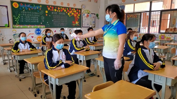 情境一,學(xué)生按年級(jí),分時(shí)段,按指定路線進(jìn)校園晨檢。保安在門(mén)口維持秩序,學(xué)生間隔一米排隊(duì)進(jìn)校,值周行政、值周教師在校門(mén)口有序引導(dǎo)學(xué)生測(cè)體溫。發(fā)現(xiàn)某生體溫高于37.3℃,交由校保健老師引導(dǎo)到臨觀室撫慰、復(fù)核,盡力避免孩子緊張恐懼。確定是發(fā)燒癥狀,按規(guī)定流程處置。