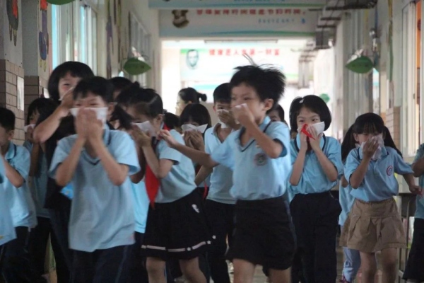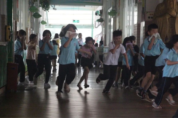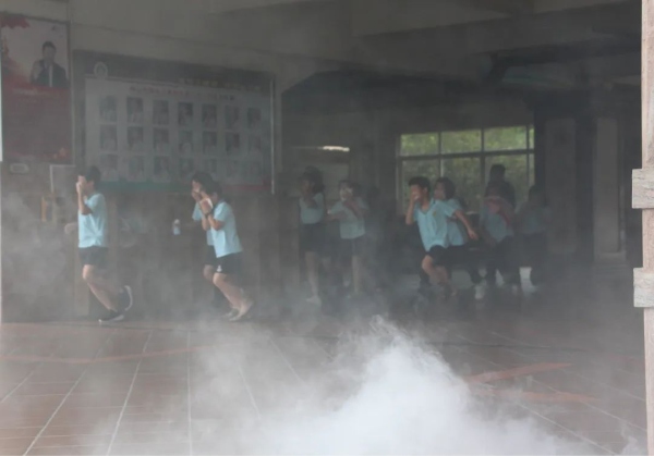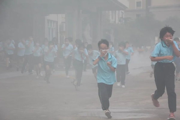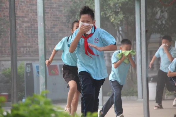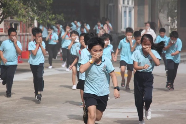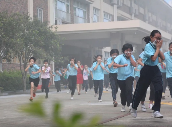 此次消防演習,是在學生完全不知情的情況下舉行的,讓活動的實際效果更加明顯。8時50分,各個樓層突然濃煙滾滾,刺耳的警報聲傳來,各位老師按照預案的要求各就各位,所有學生在老師的組織下,迅速把毛巾或紙巾打濕,按照平時指定的路線彎腰前進,有序疏散到了安全的地點。