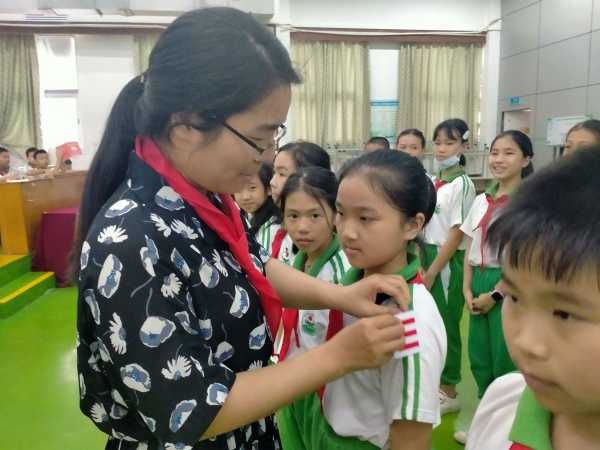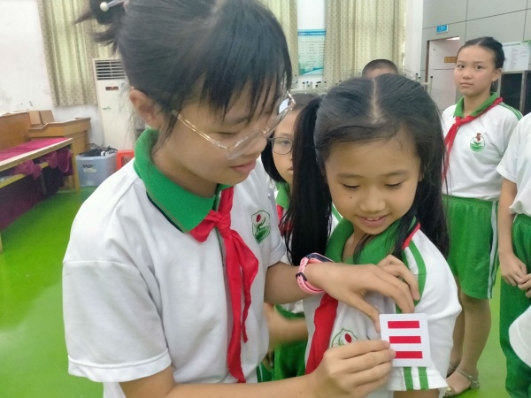 最后,少先隊大隊輔導(dǎo)員林老師和現(xiàn)任大隊長梁碧盈隊員為新一屆大隊委成員授標,一枚枚小小的隊標象征著一份大大的責任,大隊委員一定會認真履行少先隊干部職責,擔負起帶頭人的重任,為中隊、為少先隊、為學校貢獻力量。