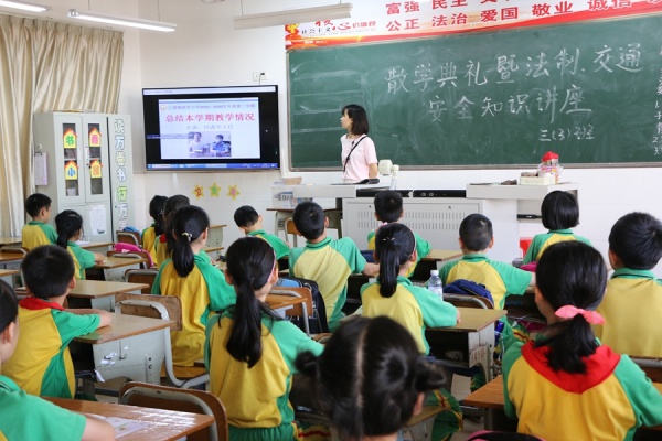 其后,高平小學(xué)莫文杰校長致辭。他充分肯定了全校師生在這個特殊的學(xué)期的付出與收獲,勉勵全體師生百尺竿頭,更進(jìn)一步,同時也對畢業(yè)生寄予誠摯的祝福與深切的厚望!莫校長從安全、健康、成長、學(xué)習(xí)、關(guān)注等幾個關(guān)鍵詞對同學(xué)們提出具體要求,希望同學(xué)們能過上一個充實(shí)、愉快的暑假。隨后,黎文輝副校長對假期安全提出詳細(xì)的要求,要求全體師生提高自我防范意識,注意用火、用電、用煤氣等安全,注意防溺水、防交通意外等事故的發(fā)生,并呼吁全校師生積極響應(yīng)創(chuàng)建文明城市號召,認(rèn)真完成德育暑假作業(yè)。教務(wù)處何滿華主任總結(jié)本學(xué)期的教務(wù)工作,勉勵全體同學(xué)多總結(jié),多反思,爭取不斷進(jìn)步。最后,激動人心的時刻到了,各班班主任對班級情況進(jìn)行總結(jié),并對本學(xué)期表現(xiàn)突出的學(xué)生進(jìn)行表彰獎勵。