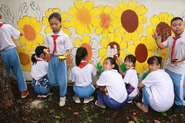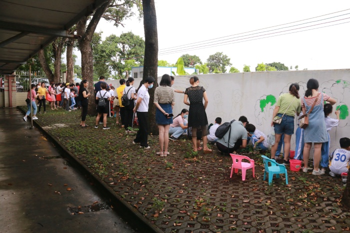 八月第一天雖然陰雨綿綿,但絲毫不影響志愿者們齊動(dòng)手、共參與的熱情,所有參與本次活動(dòng)的志愿者都早早地到達(dá)了活動(dòng)地點(diǎn)——光明小學(xué)停車場(chǎng)旁的墻壁,大家都迫不及待地想要拿起自己的畫筆進(jìn)行創(chuàng)作啦!活動(dòng)開始前,由美術(shù)老師鄧碧興和丁常臻老師在墻壁上勾勒出大概的繪畫輪廓;緊接著就由各個(gè)班的班主任分發(fā)繪畫工具,告知本班負(fù)責(zé)的繪畫區(qū)域以及注意事項(xiàng),只見(jiàn)孩子們個(gè)個(gè)都拿起畫筆,一會(huì)兒若有所思,一會(huì)兒靈機(jī)一動(dòng),家長(zhǎng)們也不甘示弱,也使出渾身解數(shù),一會(huì)幫忙遞繪畫工具,一會(huì)兒洗畫筆,在大家的合理分工,共同努力之下,原本單調(diào)的墻壁愈發(fā)變得燦爛有趣,你看!一朵朵向日葵正在和大家打招呼呢!一棵棵大樹正努力向陽(yáng)生長(zhǎng)呢!時(shí)間過(guò)得很快,活動(dòng)快要接近尾聲,但是大家卻意猶未盡,所有的志愿者努力把自己對(duì)文明城市的美好期待通過(guò)手中的畫筆呈現(xiàn)出來(lái)。