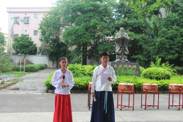 緊接著由六(2)班的學(xué)生帶來(lái)《弟子規(guī)》的誦讀表演。在他們的帶領(lǐng)下,全校學(xué)生集體誦讀《弟子規(guī)》,朗朗的讀書聲充盈了校園。然后是正衣冠儀式:自正衣冠,互正衣冠,師正衣冠?;顒?dòng)最后,全體師生向孔子像行鞠躬禮,少先隊(duì)員代表還在孔子像前為全體教師送上鮮花,向老師們送上節(jié)日最真摯的祝福。