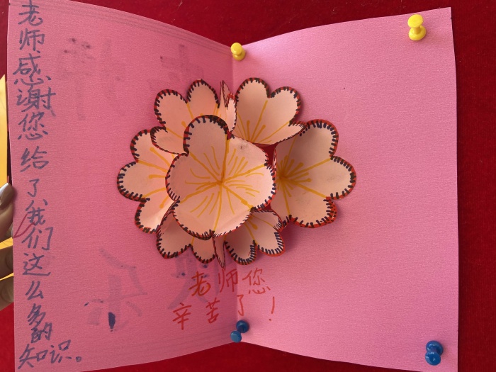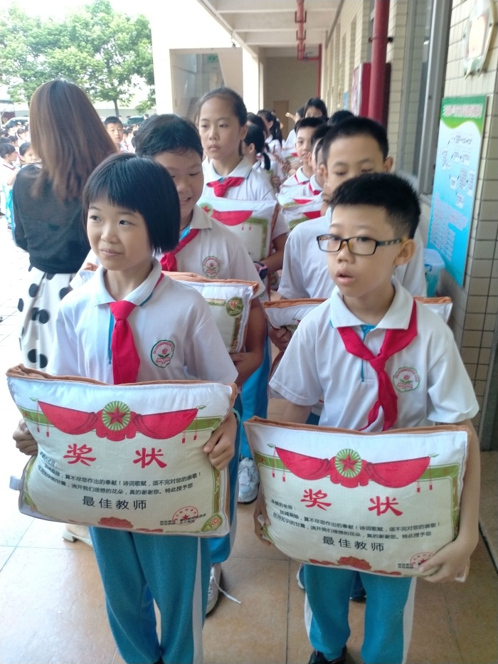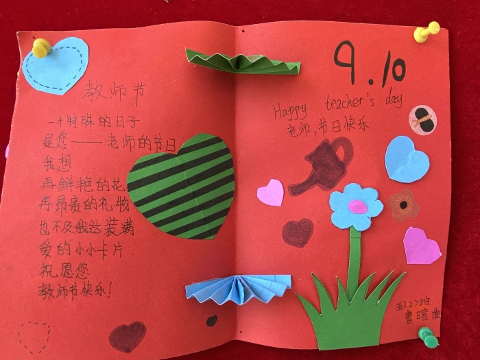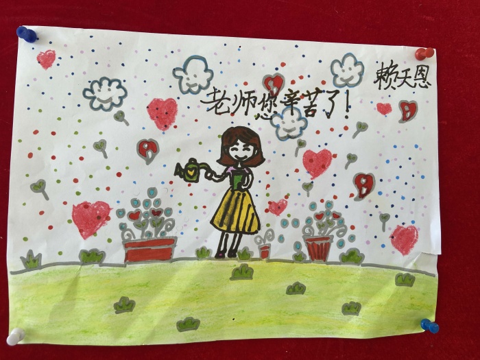 慶祝活動(dòng)結(jié)束后,少先隊(duì)大隊(duì)部向全體隊(duì)員發(fā)出“童心有愛(ài),不忘師恩”慶祝教師節(jié)活動(dòng)倡議。倡議全體隊(duì)員貫徹落實(shí)以節(jié)約為原則和用實(shí)際行動(dòng)報(bào)答恩師,表達(dá)對(duì)老師們節(jié)日的祝賀。大隊(duì)部分別組織了低、中、高年級(jí)不同的活動(dòng):一、二年級(jí)組織“童聲表恩情”活動(dòng),通過(guò)錄制小視頻的方式將節(jié)日祝福、感恩的話語(yǔ)送給教師;三、四年級(jí)組織“小手畫(huà)師容”活動(dòng),畫(huà)出你眼中老師的模樣;五、六年級(jí)組織“小小賀卡表心意”活動(dòng),通過(guò)親自制作賀卡,表達(dá)對(duì)老師的感謝,其中部分優(yōu)秀作品展示在學(xué)校的大堂里供師生們欣賞。