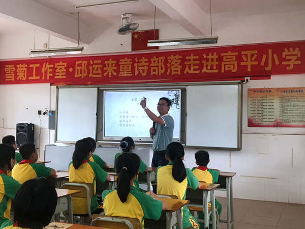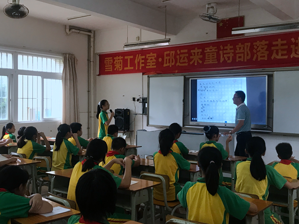 “雪菊工作室?邱運來童詩部落走進高平小學”詩歌教學觀摩活動共有三個議程。首先由邱校長給六年級的孩子上一節(jié)童詩創(chuàng)作指導課。課堂上,邱副校長從字詞到畫面,用幽默生動的語言,把學生帶進詩中,讓孩子們在讀詩中尋趣,在理解中想象,在感悟中動情。詩意彌漫的課堂喚醒了孩子們沉睡的詩情、詩意、詩心和詩性,在學生幼小的心靈中埋下了詩歌的種子。