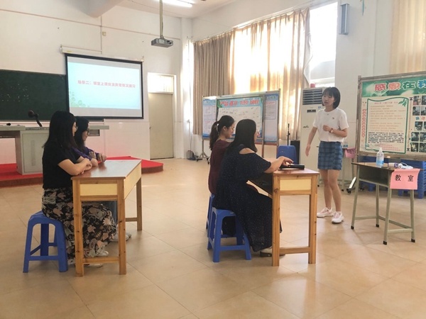 第二場景是在教室,由葉曉婷、梁鐘慧和楊小英老師分別扮演教師與學(xué)生,針對發(fā)生在教室里學(xué)生突然發(fā)熱的緊急情況的處理。葉佳娜老師所扮演的校醫(yī)則及時處理學(xué)生的情況,阻斷有可能造成的人群傳染。