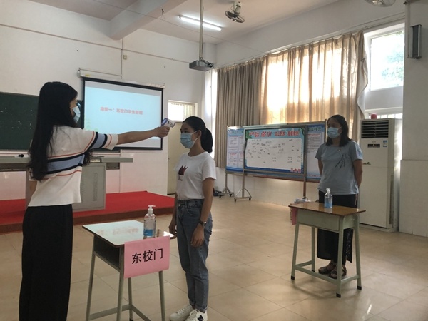 此次疫情防控演練由黃滿華校長主持召開。首先,黃長強調(diào)現(xiàn)階段仍為疫情防控階段,每一位班主任與老師都需要關(guān)注學(xué)生身體情況,因此他強調(diào)第一點每班必須準(zhǔn)備好應(yīng)急箱在教室以備不時之需。接著,疫情防控演練正式在階梯室開始。此次防控演練以進(jìn)入校門與教室兩個情景為主。校門時疫情防控的重要關(guān)卡,因此需要重點把控。林小鳳、梁銳霞、揭婷婷、葉佳娜等老師分別扮演學(xué)生與校門值日教師和校醫(yī),在學(xué)生出現(xiàn)發(fā)熱癥狀時,值日教師及時檢測出來,并通知行政主任,行政主任則及時帶領(lǐng)學(xué)生來到校醫(yī)室進(jìn)行檢測觀察,做到第一時間隔離。