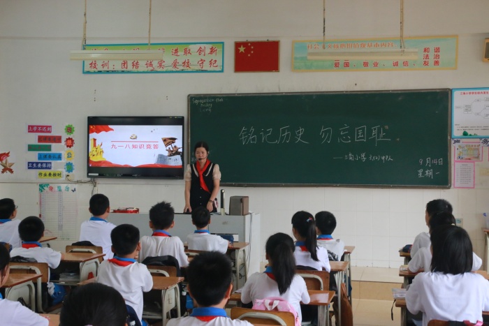 在隊(duì)會課上,老師們語氣沉重地講述九一八事變的起因經(jīng)過和歷史背景,并播放了還原九一八事變當(dāng)晚歷程的視頻。隨后,老師們向?qū)W生展示了一幅幅浸透血淚的歷史圖片,深重的民族苦難使人動(dòng)容,使人難忘;介紹了一位位身先士卒,為國犧牲的革命先烈——楊靖宇、趙尚志、王光宇、王德泰、趙一曼、馬占山,致敬英雄,追念英靈;講述了以冷云為首的東北抗日聯(lián)軍8名女官兵與日偽軍展開激戰(zhàn),誓死不降,而后集體沉江,壯烈殉國的故事。學(xué)生們還進(jìn)行了九一八知識競答,將民族的苦難記憶和偉大的愛國精神、不屈的抗?fàn)幎分居烙浶拈g。