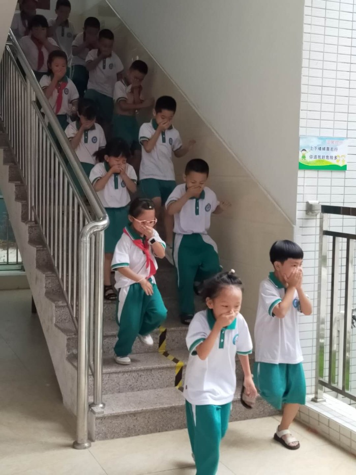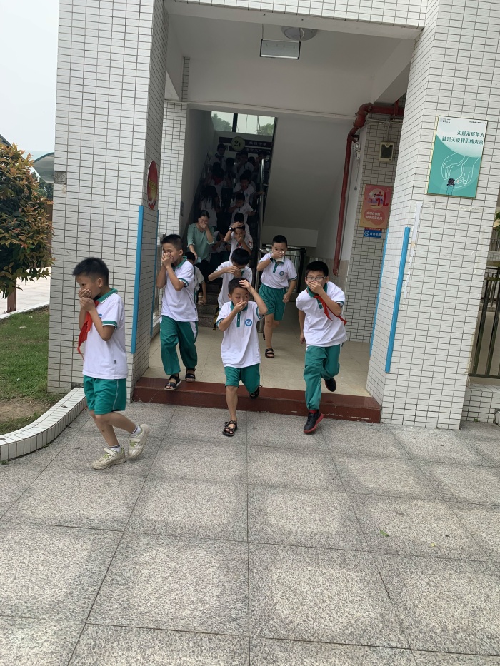 下午3:45,警報聲拉響,演習正式開始。各位老師及時準確的到達指定位置,認真協(xié)助,確?;顒影踩樌呐e行。教室內(nèi)的同學們迅速按照預案疏散線路逃生,大家用毛巾捂住口鼻、彎著腰,靠樓梯右側,安全、緊張、有序地撤離到指定位置。