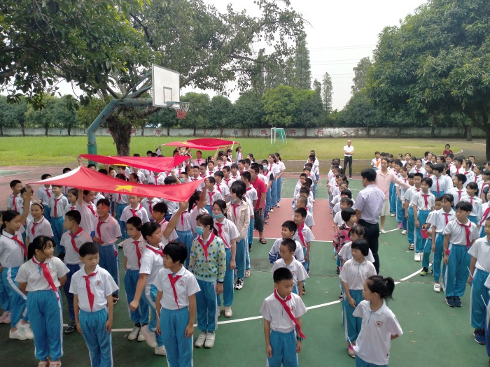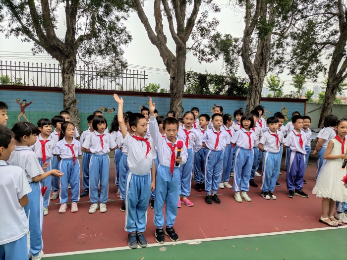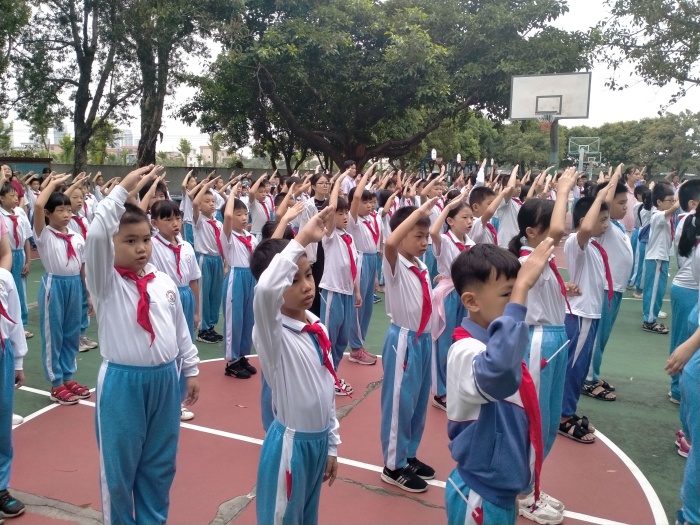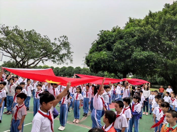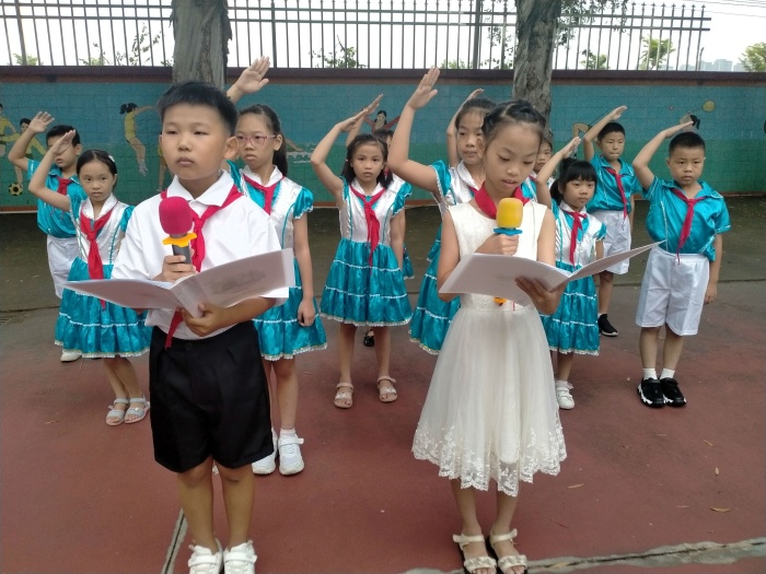 緊接著,學(xué)校旗手代表們邁著整齊劃一、鏗鏘有力的步伐,高高舉起國(guó)旗、黨旗和隊(duì)旗,從學(xué)生的隊(duì)列中莊嚴(yán)走過(guò),全體師生行注目禮。“聽(tīng)黨話、感黨恩、跟黨走”深深地烙在幼小的心靈里。
