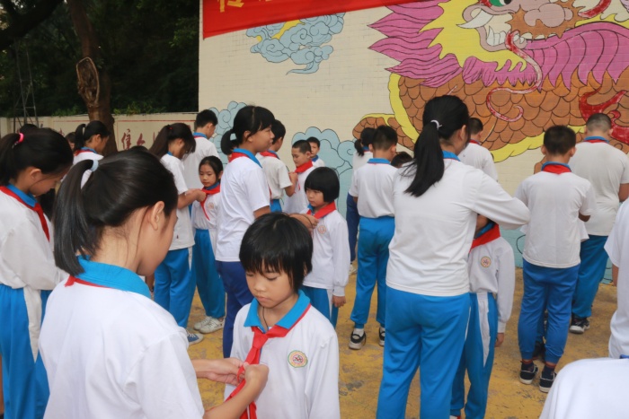 入隊(duì)儀式在莊嚴(yán)肅穆的出旗曲中拉開(kāi)了帷幕,大隊(duì)旗伴隨著雄壯高昂的旋律飄揚(yáng)。精神抖擻的隊(duì)員們齊唱隊(duì)歌,嘹亮的歌聲響徹運(yùn)動(dòng)場(chǎng)。緊接著,大隊(duì)輔導(dǎo)員廖樂(lè)詩(shī)老師宣讀組建二年級(jí)中隊(duì)的決定,并宣布新隊(duì)員名單。新隊(duì)員們滿心期待,靜候六年級(jí)隊(duì)員為之授紅領(lǐng)巾。當(dāng)佩戴上鮮艷的紅領(lǐng)巾時(shí),每位新隊(duì)員都意氣風(fēng)發(fā),喜笑顏開(kāi)。