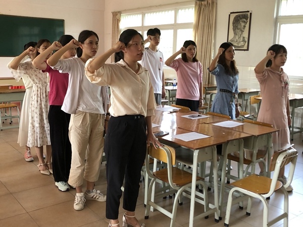 全體新老師整肅衣冠,面向國旗,右手握拳,舉于右耳旁,莊嚴宣誓:“我是一名光榮的人民教師,我莊嚴宣誓:忠誠黨的教育事業(yè),貫徹國家教育方針,履行教師神圣職責。修身立德,為人師表,終身學習,嚴謹治學;關(guān)愛學生,教書育人,傳承文明,勇于創(chuàng)新;愛國守法,愛崗敬業(yè),廉潔從教,樂于奉獻。為全體學生美好未來,我愿奉獻全部智慧和力量!”