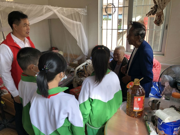 隨后在學(xué)校少先隊(duì)大隊(duì)部的組織下,結(jié)民村團(tuán)支部書(shū)記吳飛寶、結(jié)民村民政助理?xiàng)铐槻?、學(xué)校吳博事校長(zhǎng)、段美娟副校長(zhǎng)和大隊(duì)輔導(dǎo)員周文彪老師,帶領(lǐng)少先隊(duì)志愿者們,走進(jìn)了老人的家開(kāi)展了愛(ài)心慰問(wèn)活動(dòng)?;顒?dòng)中各中隊(duì)少先隊(duì)志愿者代表熱情地與爺爺奶奶們交談,給他們送上了面條、花生油和慰問(wèn)金,并祝愿他們健康長(zhǎng)壽。爺爺奶奶們一個(gè)個(gè)神采奕奕,高興不已,臉上露出了幸福的笑容。活動(dòng)在愉快的氣氛中順利結(jié)束。
