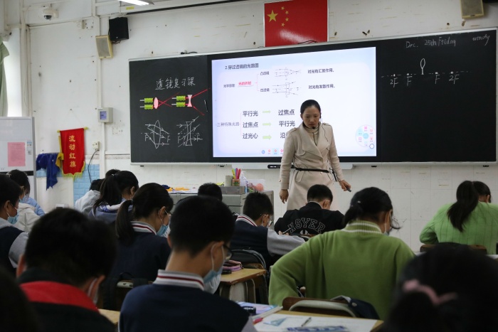 本次活動共兩個流程。首先是上課環(huán)節(jié),由三角中學(xué)侯海南老師和工作室的老師分別上一節(jié)物理課,課堂上,兩位老師呈現(xiàn)了各自的優(yōu)勢,課堂生動活潑,妙趣橫生。侯老師的復(fù)習(xí)課例《透鏡和凸透鏡成像規(guī)律》,準備充分,課件制作精美,教師善于用舊知識帶出新思考,注重技能訓(xùn)練,把復(fù)習(xí)課上得扎實、踏實。來自李楊威名師工作室的江裕芬老師帶來了課例《透鏡復(fù)習(xí)課》,課堂中,江老師把理論講解得深入淺出,運用了先進的教學(xué)儀器,生動地演示了透鏡的工作原理,引人入勝。隨后是評課、交流環(huán)節(jié)。首先由三角中學(xué)物理科組長李艷梅老師進行總結(jié)發(fā)言,李艷梅老師就科組建設(shè)這一主題,暢談對物理學(xué)科建設(shè)以及科組建設(shè)的經(jīng)驗和教訓(xùn)。接著,由李楊威副校長發(fā)言,他首先十分感謝三角中學(xué)為這次的交流活動提供了平臺,并對兩節(jié)課例進行評課,還就科組的建設(shè)方面的先進做法做了經(jīng)驗介紹。最后,由工作室的成員陳智泉老師就中考的備考策略提出了自己的兩點做法:其一是注重對資源進行整理,將教學(xué)資源“物化”成學(xué)案或試卷;其二是在備考時,要研究試題,緊跟中考命題的趨勢,準確領(lǐng)悟中考題注重情景化的特點,教會學(xué)生調(diào)用知識點能力,避免死記硬背。