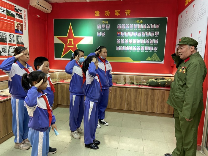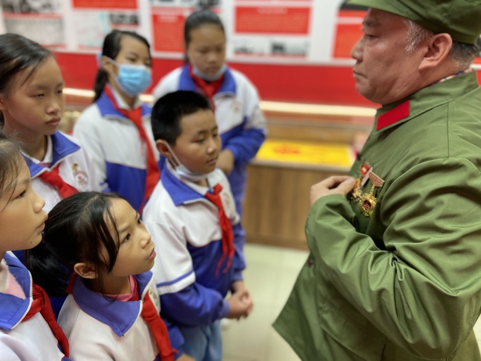 參加活動(dòng)的少先隊(duì)隊(duì)員們首先來(lái)到了三角鎮(zhèn)退役軍人服務(wù)中心,隊(duì)員們聆聽了在越南戰(zhàn)爭(zhēng)中立下偉大功績(jī)的老兵翁錦泉爺爺講述的戰(zhàn)斗故事。孩子們一個(gè)個(gè)聽得專心致志,被吳爺爺?shù)挠⒂率论E深深地感動(dòng)了,心中肅然起敬,臉上情不自禁地流露出自豪的神情。