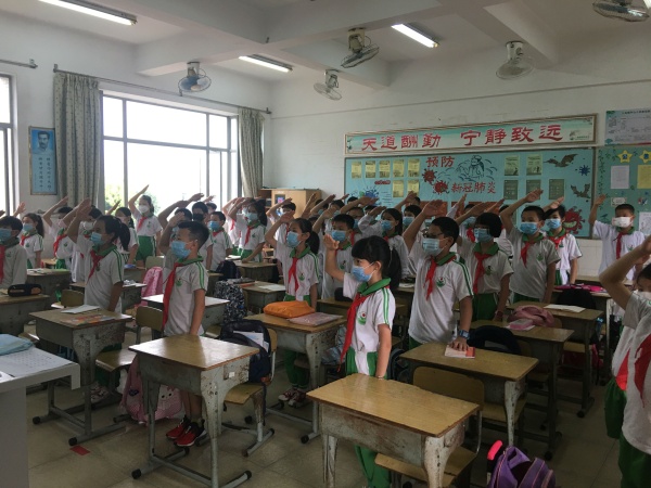 早上8:10,舉行莊嚴(yán)的升旗儀式。升旗儀式結(jié)束后,三角鎮(zhèn)中心小學(xué)周榮純校長(zhǎng)做復(fù)學(xué)第一課國(guó)旗下講話,強(qiáng)調(diào)疫情防控形勢(shì)依然不容放松, 雖然我們不能沖在疫情防控一線,但是我們要和祖國(guó)心連心,堅(jiān)定必勝的信念,體現(xiàn)我們少年兒童的責(zé)任感和使命感。