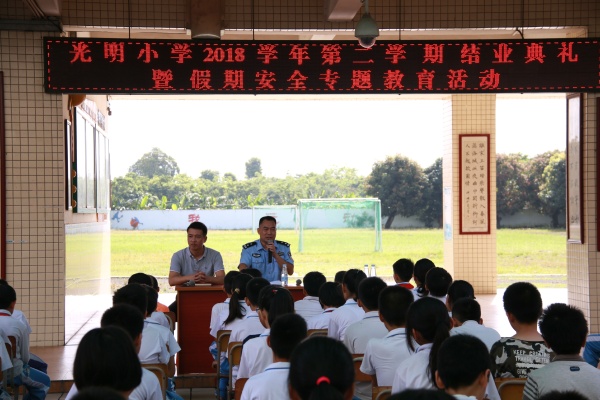 為了讓孩子們度過一個(gè)安全、充實(shí)、有意義的暑假,指導(dǎo)家長做好對(duì)孩子假期生活的安排,2019年7月5日上午,光明小學(xué)舉行了2018學(xué)年第二學(xué)期結(jié)業(yè)典禮暨假期安全專題教育活動(dòng)。