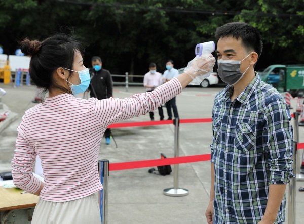 當天,模擬學(xué)生進校的老師佩戴口罩,有序排隊,依次測量體溫,發(fā)現(xiàn)一學(xué)生體溫異常,立即由值日校醫(yī)詢問,并陪同到校門口臨時隔離點等候。