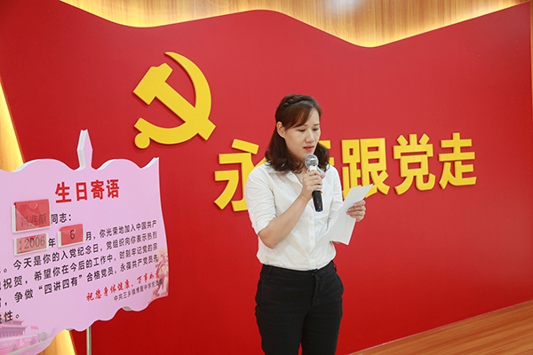 隨后,張政書記為過生日的黨員老師賀詞,并鼓勵他們時刻以黨員的身份嚴于律己,勇?lián)厝?,爭做模范,全體黨員共同為即將到來的“七·一”黨的生日獻唱一首《唱支山歌給黨聽》來表達心聲。